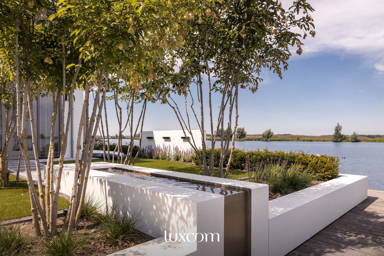 Deze villatuin is een parel aan het water. De grote vormvrijheid van Luxcom komt goed naar voren in deze moderne tuin. Zo bevat de tuin meerdere poly-pleister muren en een stijlvol waterelement. Zelfs de gashaard in de overkapping is door Luxcom gerealiseerd.