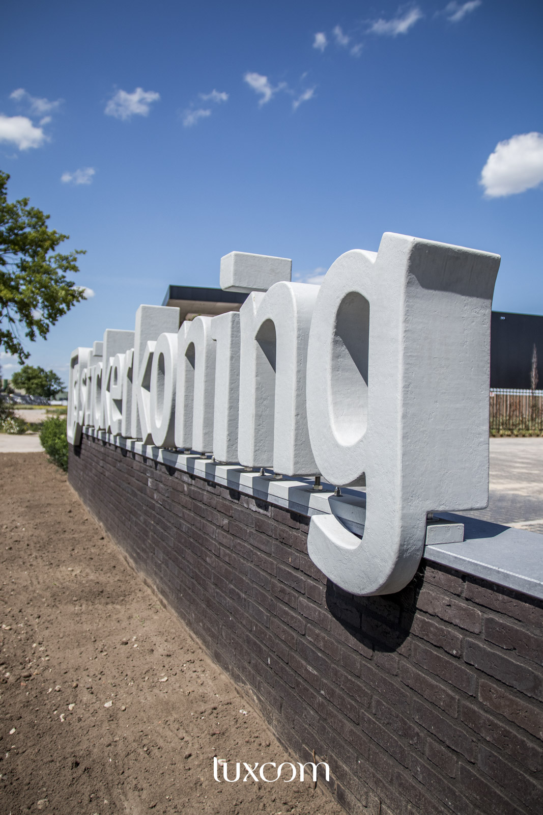 Zo kwam de architect op het idee om het logo 9 meter breed op een muur te plaatsen aan de straat. Dit bleek in traditioneel beton bijna onhaalbaar vanwege het gewicht. Luxcom realiseerde dit project door het logo cnc uit te frezen en te bewapenen met de glasvezel. Super licht!