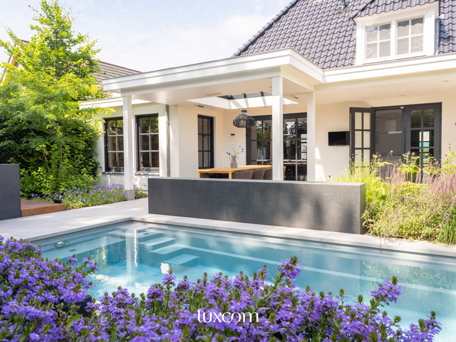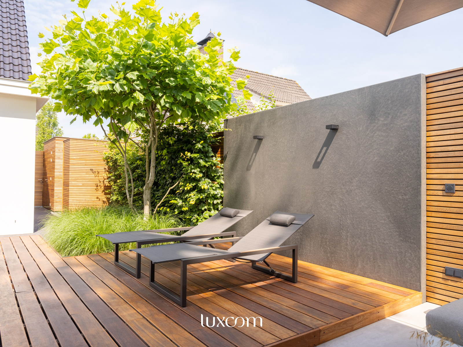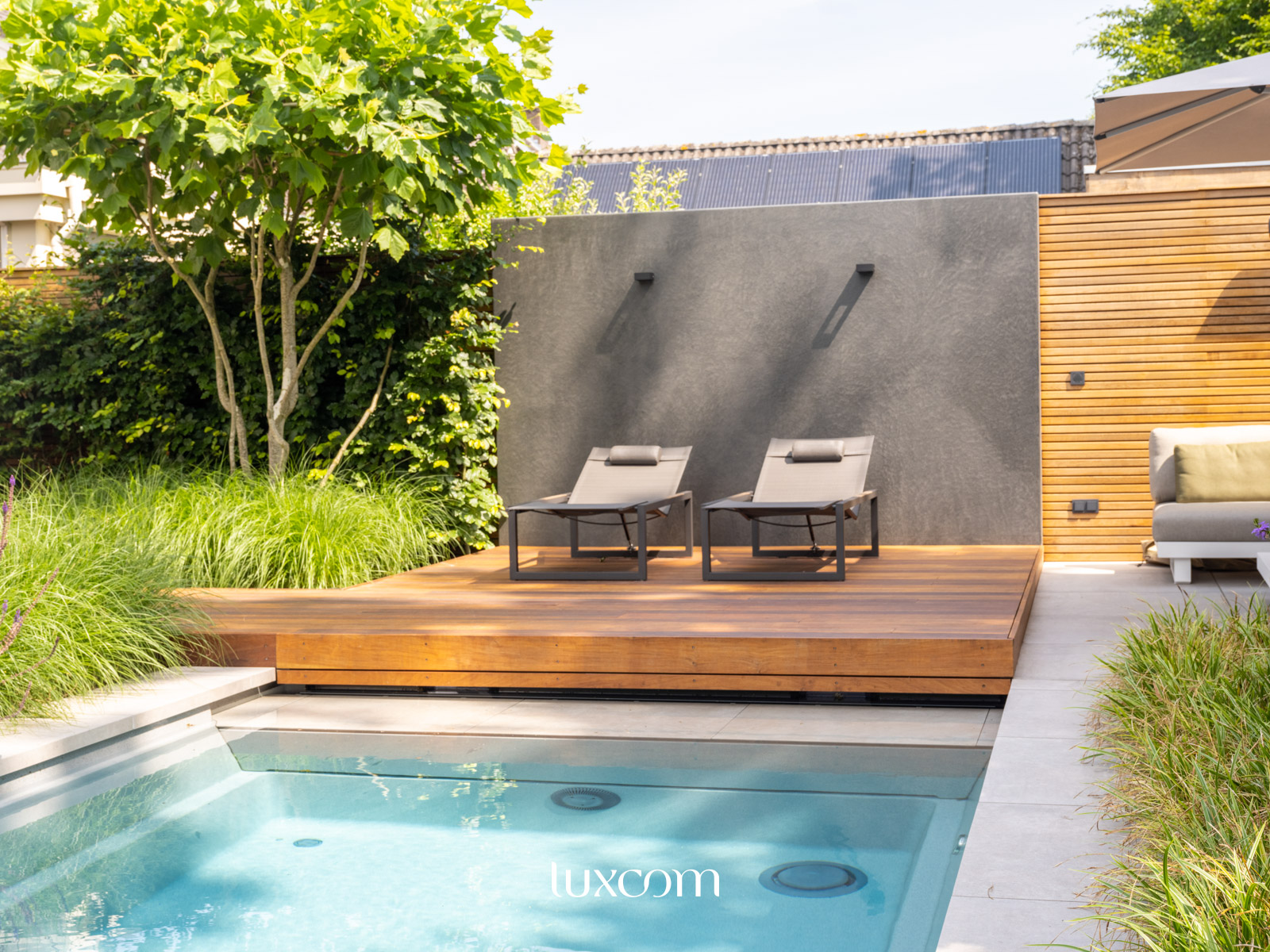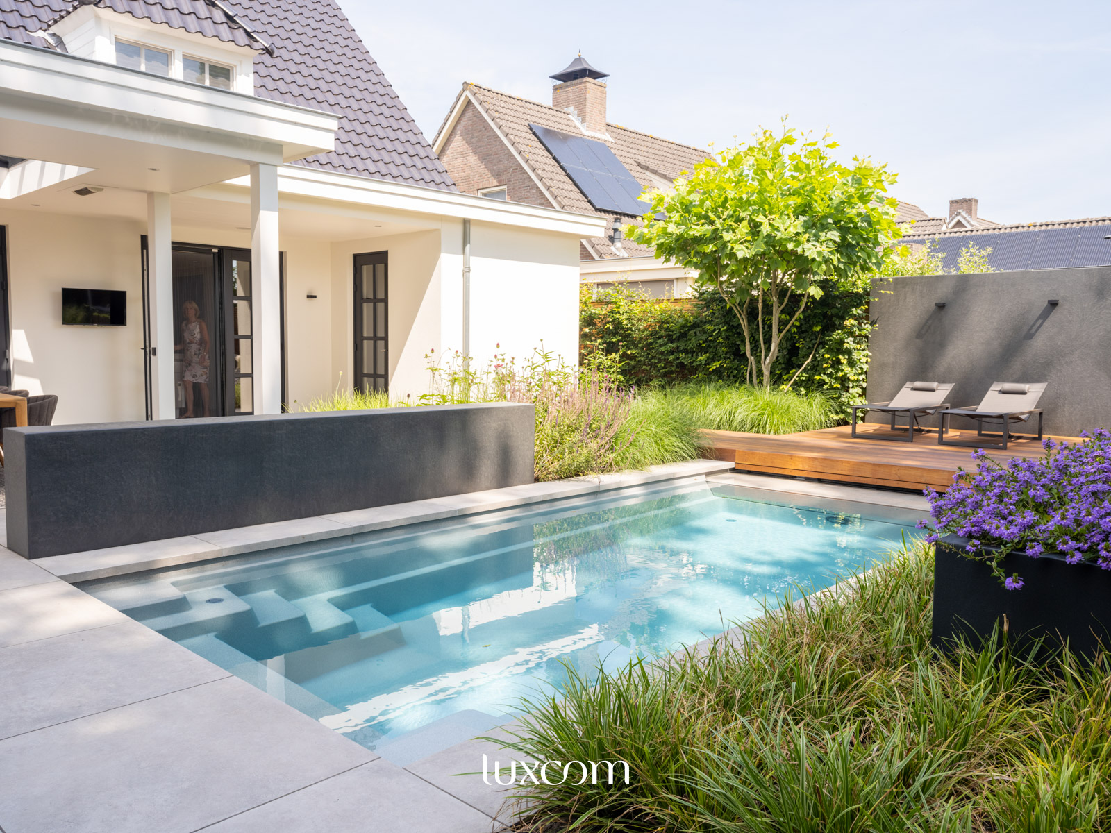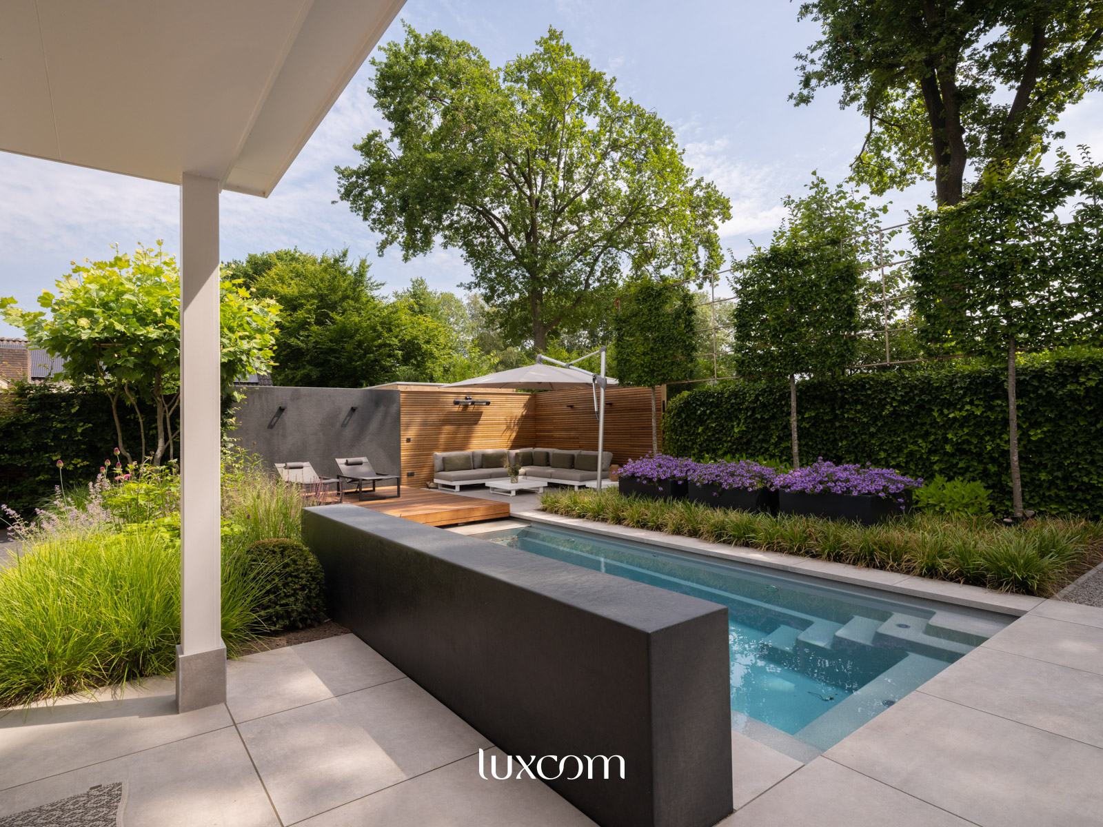 Na een upgrade van het interieur van dit huis, was het tijd voor de tuin. De wens voor een zwembad was groot. Het luxe wellnessplaatje wordt compleet door de jacuzzi en buitendouche. De Luxcom muren versterken de strakke en stijlvolle uitstraling van deze tuin.